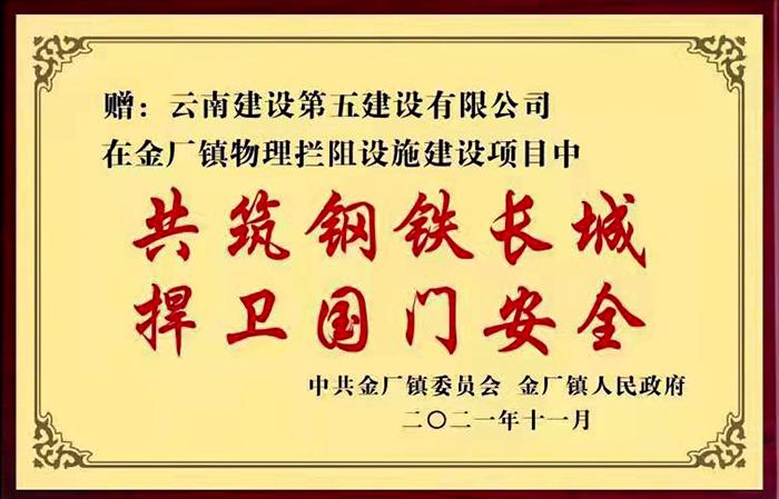 “共筑鋼鐵長城 捍衛(wèi)國門安全”,金廠鎮(zhèn)對公司在金廠鎮(zhèn)物理阻攔設(shè)施項目建設(shè)中同心同向、共克時艱、迎難而上的付出表示誠摯感謝。