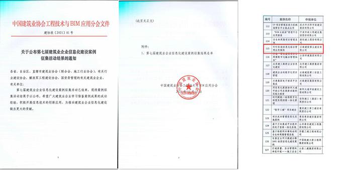 近日,中國建筑業(yè)協(xié)會工程技術與BIM應用分會發(fā)布了《關于公布第七屆建筑業(yè)企業(yè)信息化建設案例征集活動結果的通知》(建協(xié)技[2021]01號),由公司申報的《釘釘系統(tǒng)信息化綜合管理應用案例》獲評第七屆建筑業(yè)企業(yè)信息化建設案例Ⅲ類成果。
