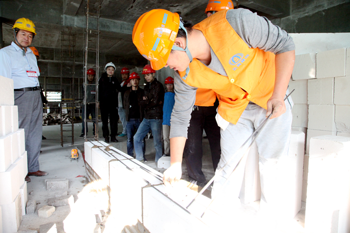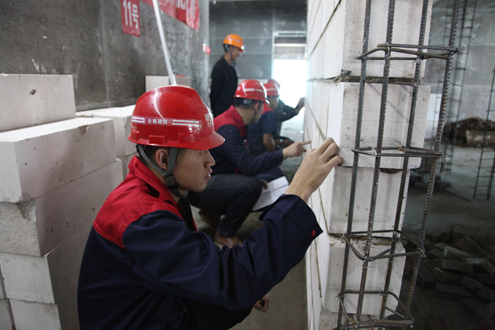 比賽當(dāng)天,在所有參賽選手進(jìn)行安全教育及競(jìng)賽相關(guān)注意事宜后,九點(diǎn)整,各參賽選手及其助手便各就各位,在海源財(cái)富中心項(xiàng)目6幢號(hào)上演了一場(chǎng)精彩的競(jìng)技PK賽,經(jīng)過1個(gè)半小時(shí)的激烈比拼,其中的12個(gè)砌磚小組在規(guī)定時(shí)間內(nèi)完成了比賽內(nèi)容。本次競(jìng)賽現(xiàn)場(chǎng)設(shè)有10名裁判進(jìn)行現(xiàn)場(chǎng)監(jiān)督,并嚴(yán)格按照砌體結(jié)構(gòu)工程施工質(zhì)量驗(yàn)收規(guī)范進(jìn)行考核,從工藝、質(zhì)量、熟練度等方面進(jìn)行綜合評(píng)比出優(yōu)勝者。
