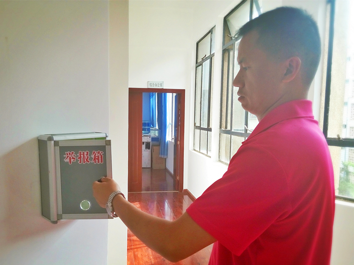 技術(shù)支持: 方森科技 近日,公司路橋二部的辦公室門口多了一個鐵箱子,上邊白底紅字的寫著“舉報箱”。職工可以往箱子里投遞舉報信件,向直管部紀(jì)檢小組反映干部違紀(jì)問題。直管部職工了解了舉報箱的用處后,說:“比起當(dāng)面檢舉,寫信投遞的方式更能讓職工說出心里話。”