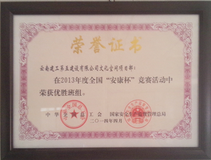 技術(shù)支持: 方森科技 6月18日,中華全國總工會和國家安全生產(chǎn)監(jiān)督管理總局聯(lián)合在北京召開2013年度全國“安康杯”競賽表彰暨經(jīng)驗交流電視電話會議,會上,中華全國總工會、國家安全生產(chǎn)監(jiān)督管理總局發(fā)布總工發(fā)〔2014〕19號《關(guān)于表彰2013年度全國“安康杯”競賽先進集體和優(yōu)秀個人的決定》,公司第四直管項目部文化空間項目部榮獲2013年度“全國安康杯競賽優(yōu)勝班組”稱號。