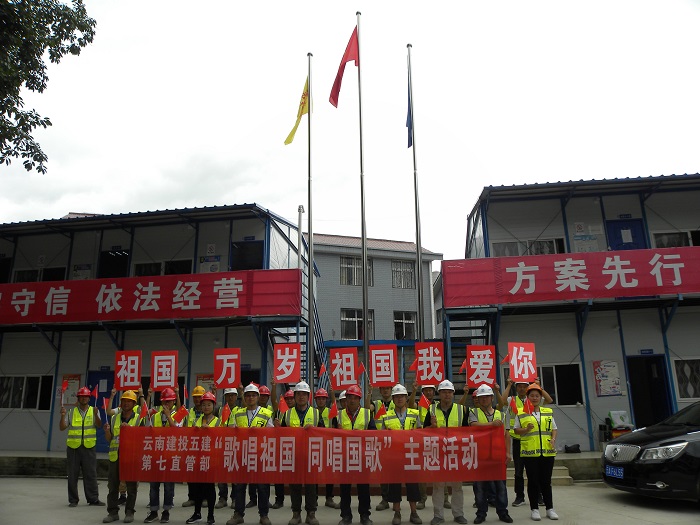 活動(dòng)先后在直管部、蘭坪縣營(yíng)盤(pán)鎮(zhèn)易遷項(xiàng)目、蘭福公路項(xiàng)目、嶍峨古鎮(zhèn)項(xiàng)目分別進(jìn)行。在項(xiàng)目部以開(kāi)展集中升國(guó)旗儀式,合唱、同唱國(guó)歌,快閃等方式,以《義勇軍進(jìn)行曲》《建投之歌》《我和我的祖國(guó)》為主唱曲目唱響愛(ài)國(guó)歌曲。