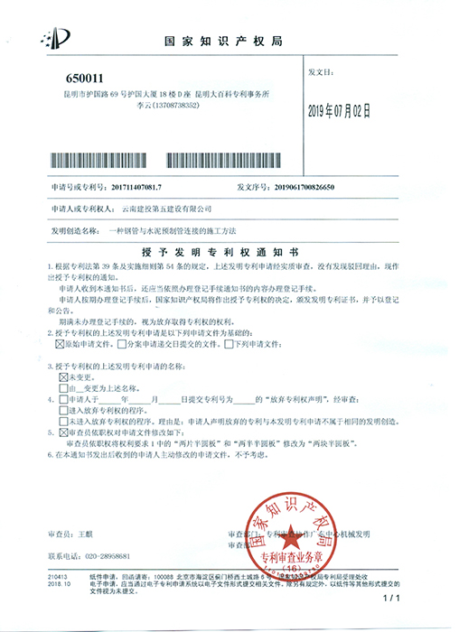 技術(shù)支持: 方森科技近日,公司《一種鋼管與水泥預(yù)制管連接的施工方法》與《一種鋼管與玻璃鋼夾砂管連接的施工方法》兩項(xiàng)技術(shù)成果榮獲國(guó)家發(fā)明專利授權(quán)。