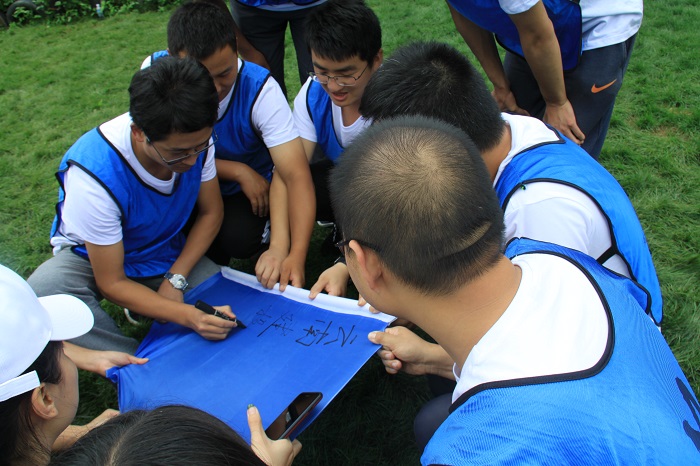拓展開始通過報(bào)數(shù)的方式將成員分成了4個(gè)組,15分鐘的時(shí)間選出每個(gè)隊(duì)的隊(duì)長(zhǎng)、隊(duì)長(zhǎng)助理、隊(duì)名、口號(hào)、隊(duì)旗、和隊(duì)形并在其他組面前展示。經(jīng)過各個(gè)小組的一番頭腦風(fēng)暴,一個(gè)個(gè)響亮的隊(duì)名和富有象征意義的隊(duì)旗逐一精彩亮相。