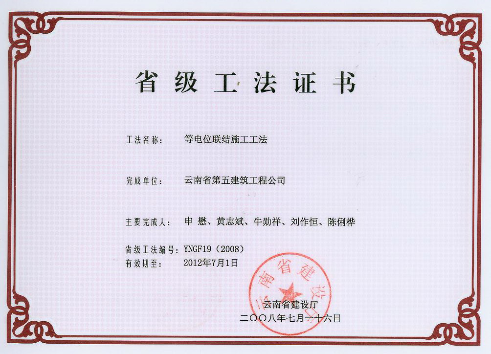 云南五建編制的省級工法——建筑物總等電位連接施工工法