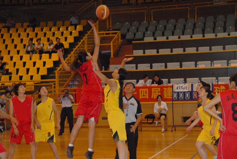 圖為女隊(duì)決賽現(xiàn)場(chǎng) 五公司(紅)VS總承包公司(黃)