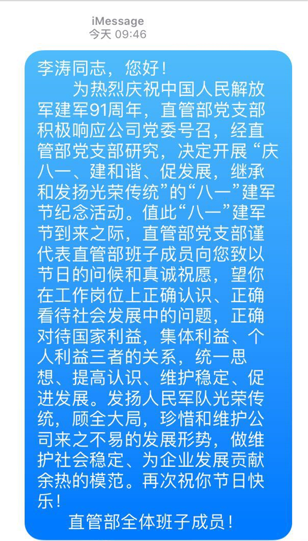 8月1日,第四直管項(xiàng)目部黨支部積極響應(yīng)公司黨委號(hào)召,在直管部開展主題為“慶八一、建和諧、促發(fā)展,繼承和發(fā)揚(yáng)光榮傳統(tǒng)”的“八一”建軍節(jié)紀(jì)念活動(dòng)。 在“八一”建軍節(jié)到來(lái)之際,直管部黨支部書記陳德正代表黨支部和直管部領(lǐng)導(dǎo)班子向兩名復(fù)退轉(zhuǎn)崗軍人發(fā)送了慰問短信,并以電話的方式再次向他們表達(dá)節(jié)日的祝福和問候。望他們?cè)诠ぷ鲘徫簧险_認(rèn)識(shí)、正確看待社會(huì)發(fā)展中的問題,正確對(duì)待國(guó)家利...