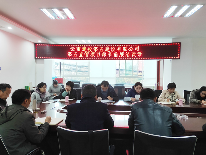 1月2日,第五直管項目部黨支部召開專題會議,開展節(jié)前廉潔談話。由黨支部書記對直管部領(lǐng)導班子成員、部門、項目部主要負責人、黨員、二線部門管理人員進行了一次集中廉潔談話。會上,黨支部組織黨員集中學習了集團印發(fā)的《云南省建設(shè)投資控股集團有限公司紀委關(guān)于加強2019年元旦、春節(jié)期間紀律作風建設(shè)的通知》。 黨支部要求黨員干部要進一步強化紀律和規(guī)矩意識,緊繃思想作風之弦,始終守住做人、處事、...